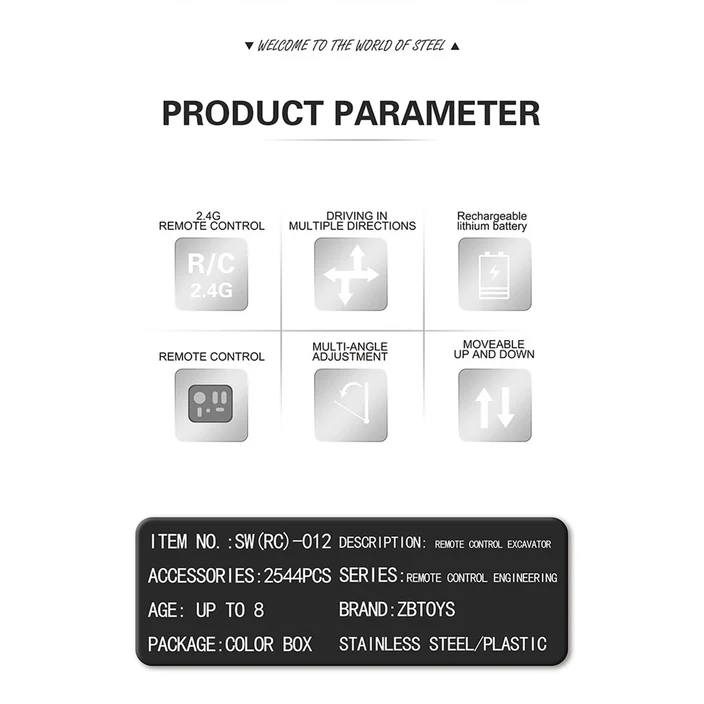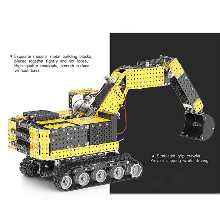 .Packing List: Construction vehicle excavator assembly *1 set, Remote control *1, Charging cable *1, Tools *1 set, several spare screws, Manual *1