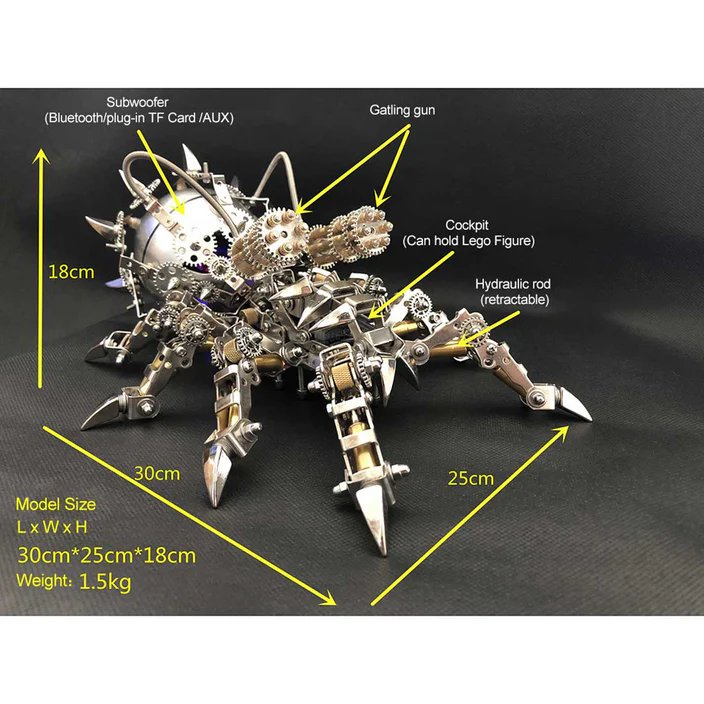 .Each joint is movable, and the cockpit can also sit on a building block minifigure (self-provided) as a driver. The belly of the mechanical tarantula is a subwoofer speaker (built-in 500mah lithium battery), which can be connected to a mobile phone via Bluetooth or plug in TF memory Card playing music
