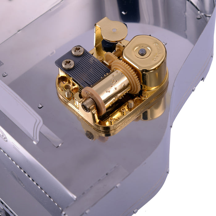 . Amazing details: The “Grande Pianola” aesthetic feature is the integration of metal parts of various colors. The piano’s body comprises steel color. Chrome-plated keys serve as the model realism enhancing. The “gold” casing of the music mechanical Sankyo music box gives an appearance with a warm reflective tone and an expensive accessory. The music stand’s unique design and the lyre’s delicate design give the grand piano a beautiful grace. The “Grand Piano” can be in two positions – turn music off and on.