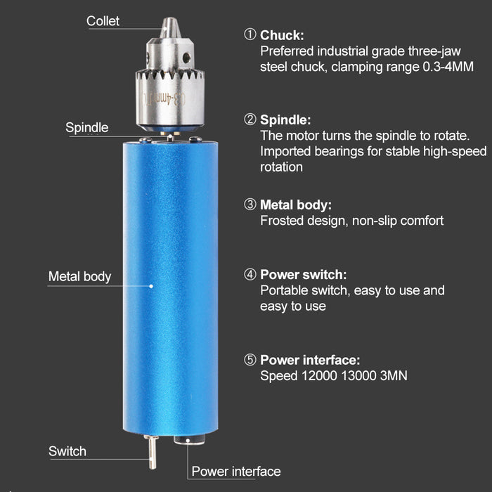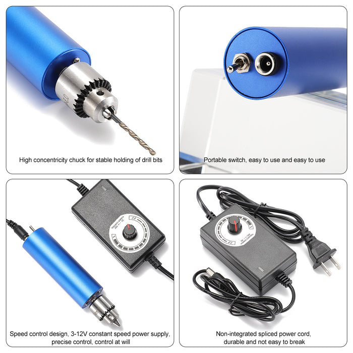 .Compact & Lightweight: Features compact body, sufficient power, high-concentricity chuck for stable clamping, portable switch for easy operation, spliced power cord for durability and not easy to break as well as adjustable 3-12V speed power supply for accurate control.