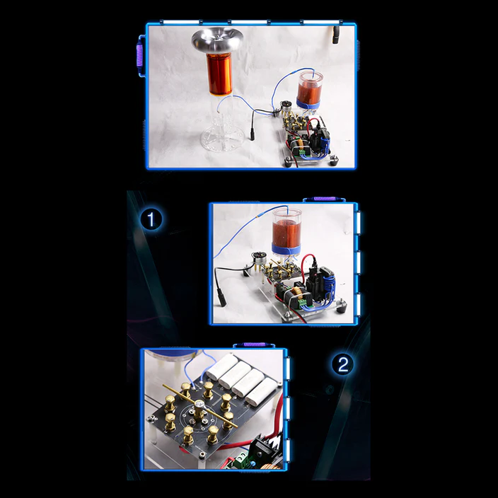 .Technical Essential: (1) ZVS+ high voltage package booster circuit, simple and reliable, easy to repair or replace. (2) 8 high-voltage resonant capacitors accurately match the coil parameters to maximize the arc. (3) The original design of rotating spark gap greatly extends the service life of the product and is full of sense of science and technology. (4) Original design of separating primary and secondary coils, beautiful in appearance, preventing sparking and safe to use. (5) Low-pressure primary epoxy glue seal to extend life. (6) Dual power supply design, adjustable motor speed and frequency.